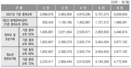 2021년 지원가구별 소득인정 금액은 다음과 같다고 합니다.