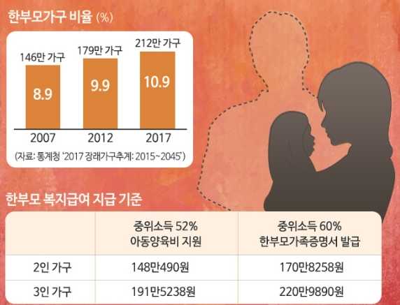아버지 혹은 어머니 한분으로 구성된 가족이거나 만약 한부모가 만 24세인 경우에는 청소년 한부모가족이라고 분류 됩니다. 또 번외로 아동이 부모로부터 부양받지 못하여 조부 또는 조모가 양육하는 경우에는 조손가족으로 분류 됩니다.