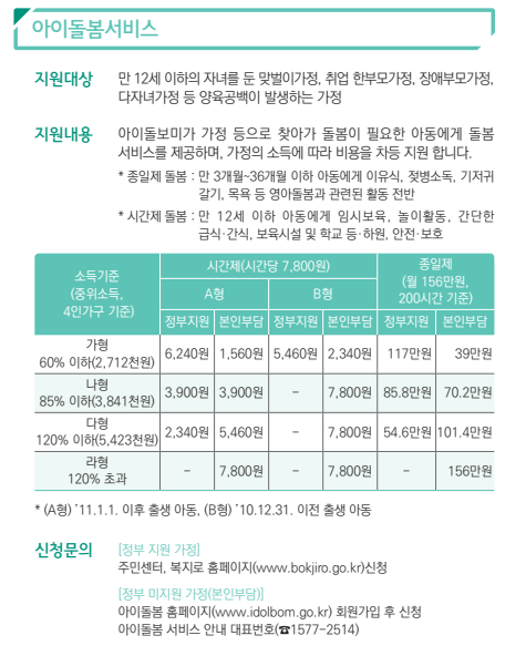 아이돌보미가 가정 등으로 찾아가 돌봄이 필요한 아동에게 돌봄 서비스를 제공하며, 가정의 소득에 따라 비용을 차등 지원 합니다.