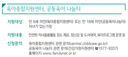 * 시간제 돌봄 : 만 12세 이하 아동에게 임시보육, 놀이활동, 간단한 급식·간식, 보육시설 및 학교 등·하원, 안전·보호