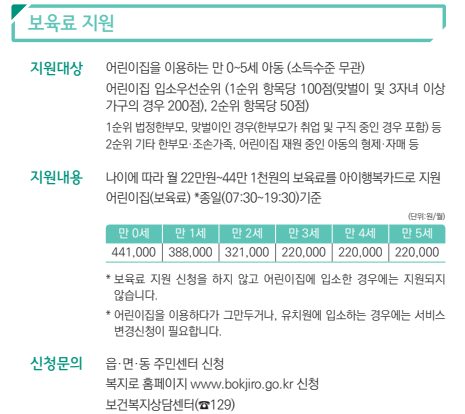나이에 따라 월 22만원~44만 1천원의 보육료를 아이행복카드로 지원 어린이집(보육료) *종일(07:30~19:30)기준